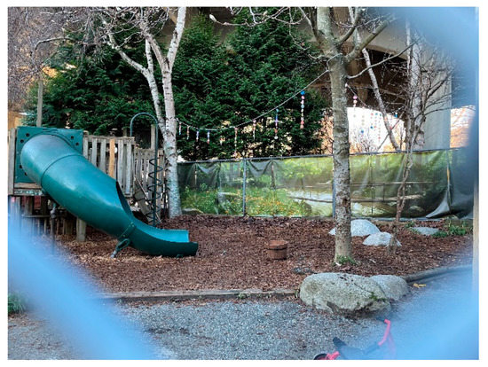 The yard had some mature deciduous trees, but many plants had died or had been removed and not replaced. The Water Pump site was sloped with the grade descending into the childcare building (Figure 8). According to the ECE, the children liked running up and down the slope, but when it rained water rushed down into the building entrance overwhelming the drain. The play space was located next to a major bridge leading to downtown Vancouver, and the majority of the north side of the site looked under this bridge. The chain link fence was transparent and the recent removal of bamboo plants by maintenance staff increased visibility between the two spaces (Figure 9). The ECE noted that children frequently witnessed adults engaged in inappropriate activities taking place under the bridge, and they felt it necessary to sometimes prohibit children from playing in that part of the play space. This resulted in Water Pump receiving the lowest Context score of 10 out of 25.