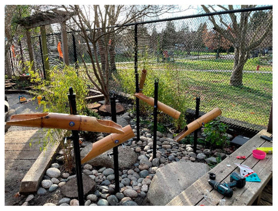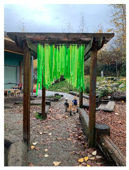 The installation of the interventions created a paradox for the students. The YMCA children are required to be outside every day and an overarching aim of the PRO-ECO project and the Rewilding Play Studio is to promote outdoor play. However, many student interventions were installed in situ for approximately four weeks while children were playing outdoors. Keeping children out of construction areas tested ideas of risk, in particular, among PRO-ECO champions, ECE, and licensing officers. Some licensing officers asked students to work with the ECE and to use yellow caution tape to keep children out of installation areas. Other licensing officers viewed any use of tools by students as dangerous to the children and they required students to use snow-fencing secured to heavy-duty posts to cordon off all installation areas. Interestingly, the heavy-duty cordoning with snow fencing piqued children’s curiosity about what the students were doing, and the children often wanted to help the students. This prompted some ECE and students to devise ways that children could be involved, while not being directly inside the construction zone. At Little Bunny, for example, children were asked to find only yellow leaves for the students to cut into mulch. This turned into an intriguing game for the children who searched the play space identifying and picking up only yellow leaves.