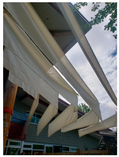 Teams designing and installing overhead dappled light shade structures provided variable replicability for other centres. The Crawley Cubbies shade structure was designed in a novel series of suspended panels that could be easily duplicated, but the light quality is not dappled (Figure 48). The Little Bunny shade sale provided dappled light, however, the design involved blow torches to simultaneously pierce and melt the edges of the holes and would not be as easily replicated. Simply puncturing holes in a shade structure fabric can lead to fraying and compromise the material. The edges should be melted to prevent this fraying.