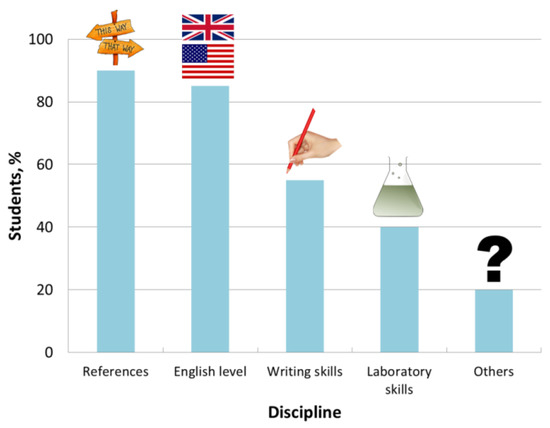This is one of the most important stages during the FDP process, being the first contact between the tutors and the student. In this meeting, the main goals of the FDP are exposed and the tutors know the main particularities of the student (time availability, knowledge about basic aspects such as scientific English level, if they have any pending subjects in the degree, etc.). Based on the information gathered at this first meeting for our students (for eight consecutive courses, included in Table 1), their skills and personal circumstances are evaluated. They were asked about different aspects that we consider important to carry out an FDP properly, including the following items: references (for instance, how to cite an author), English level, writing and laboratory skills and others (where the students can add any particularity that can affect the correct development of their FDP). From our results, the main aspects that we should focus on (to carry out the final degree project properly) can be drawn out in Figure 2, where the percentage of students having problems with each subject is included.