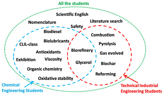 As can be seen, depending on the skills of the student, we will focus on some aspects at the expense of others. For instance, for students from the Industrial Engineering School, whose main research (related to our laboratory) is combustion and pyrolysis of biomass, we will provide them a literature focused on these fields, rather than biodiesel or biolubricant synthesis (which is usually suitable for chemical engineering students). On the other hand, other subjects can be shared by Chemical and Technical Engineering students, such as those related to biorefineries or glycerol. This fact points out the possibility of adaptation of this method to other subjects in STEM disciplines (as it is a matter of including a new circle in this figure, with their specific and common contents).
