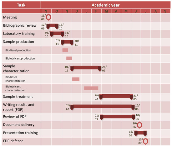 After the first meeting, where the main needs of the student are also considered (for instance, the possibility of defending the FDP as soon as possible, future professional expectations, etc.), a schedule is designed and proposed to the student, based on previous experiences where tutors or mentors had the opportunity to assess the average duration of each proposed task. In that sense, the schedule is usually designed to foresee future eventualities during the development of the FDP (for instance, time off work of tutors, or confinements due to COVID-19 outbreak, among other countless reasons), adding “extra time” for each task to ensure that all of them are accomplished on time. Figure 4 shows an example of a schedule, with the main tasks disaggregated in other specific tasks.