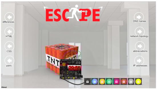 The story of the digital escape room consists of a terrorist threat, namely the placement of an explosive device by terrorists in a stadium full of people. The time limit to defuse the bomb is 30 min and there is no time to evacuate people from the stadium. In the game, it is necessary to successfully solve eight independent levels. After successfully solving each level, the student receives a key, and only after obtaining all eight keys can the bomb be deactivated. The first four tasks are focused on knowledge in the field of creating websites while the next four tasks are focused on knowledge in the field of computer networks (Figure 1). Help was available for each of the levels, which was supposed to prevent students from getting stuck on a puzzle for too long, which could cause students boredom or frustration .