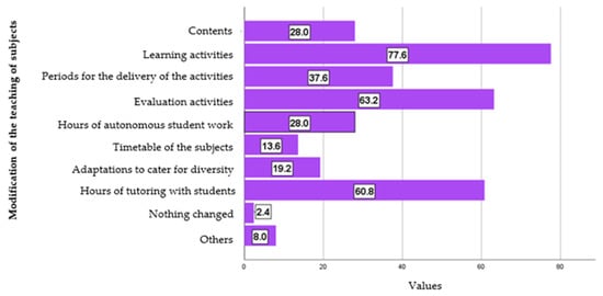 The activities that were modified, as expected, were learning activities and evaluation [28], along with an increase in the number of advising/tutorship hours, given that didactic strategies and the manner in which interaction and evaluation remotely had to be modified. Providing the students with more time for advising/tutorship, as pointed out by [20], promotes active interaction and participation of students, providing evidence of the role as a companion that the professor must play in education mediated by the ICT.