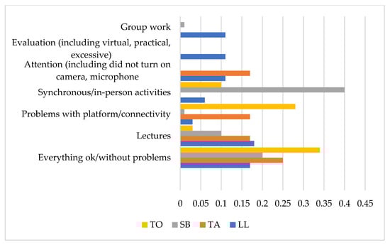 Other activities that were not successful, with each receiving less than 5% of the total number of responses, included continuing with the activities and schedule of assignments that had been used prior to the pandemic and continuing with required readings, especially those that were more theoretical in nature. Overall, responses to the question regarding unsuccessful activities mirrored those reported above for successful activities. Whereas most of the successful strategies and activities could be described as those that fostered active participation, those described as unsuccessful were those that did not permit active participation or in which student interaction was difficult to achieve. This, in turn, has implications for student learning. As one faculty member observed, “Permanent interaction that allows us to address greater levels of complexity in the construction of knowledge is necessary”.