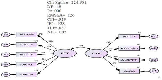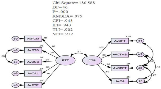 First, a suitable initial measurement model is required. An appropriate model is one that fits appropriately with the data, so appropriateness indices must be calculated and model estimates computed. Figure 3 below describes the initial model fitness. Before starting statistical analysis, the data were examined to ensure that essential assumptions, such as validity, reliability, and unidimensionality, were satisfied. Since the construct items have good satisfactory factor loadings, this represents unidimensionality, as shown in Figure 3. The composite reliability (CR) was examined to ensure good construct validity. As shown in Figure 3, the standardized loadings for all the observed variables were higher than 0.50 [58]. Because the squared correlation between each pair of constructs is opposite to the average of the AVEs for these two constructs, discriminant validity exists. The PTT constructs’ average variance extracted (AVE) values varied from 0.89 to 0.94, whereas the CTP constructs’ AVE values ranged from 0.75 to 0.95. Thus, all the constructs that have been used in this study showed good reliability and validity, as shown in Figure 3.