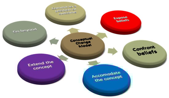 Conceptual change is learning that changes a current conception. This involves a process that leads to a paradigm shift in an individual’s pre-instruction ideas [13]. Conceptual change is not instantaneous; it needs time to situate a learner’s current beliefs in the context of what is being learned, explore new ideas, reconcile new information with one’s current understanding, and explain phenomena using new ideas [14]. Research has pointed out that a straight swap of students’ pre-existing conceptions with new ones is not probable; conceptual change is a gradual/systematic replacement of scientific conceptions with accurate ones [15,16]. Conceptual change has been studied expansively in science education, where students frequently hold alternative conceptions about biology, physics, chemistry, mathematics, and engineering that conflict with the scientifically accepted concepts that the educational curriculum seeks to inculcate. Conceptual change is vital in science education due to the many misconceptions students cultivate due to their daily life experiences, intuitive thinking, popular media, and ineffective science instruction [17].