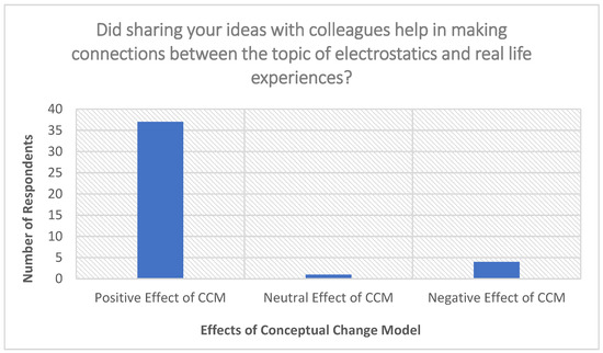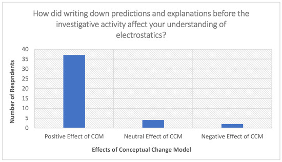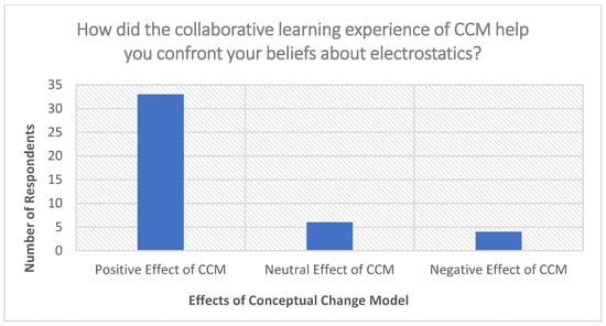 The CCM phases also included a collaborative learning experience; when participants were asked about their collaborative learning experience, 33 out of the 43 participants (76.74%) responded that CCM had a positive effect in helping them confront their beliefs about electrostatics. Figure 3 provides a graphical summary of participants’ responses to question three. Participant (PST 11) wrote: