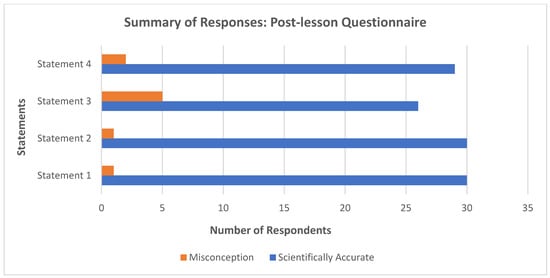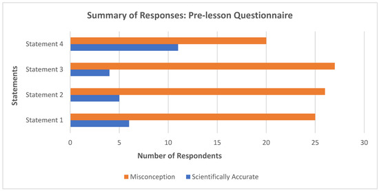 Figure 5 and Figure 6 below present a graphical interpretation of the analyzed data. As can be seen from the results, participants provided more scientifically accurate responses in their post-lesson questionnaire compared to the pre-lesson questionnaire. Participant (PST09) wrote in the pre-lesson response to statement one: