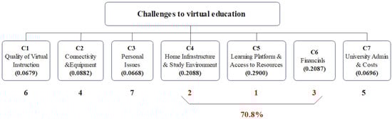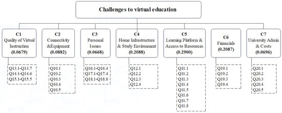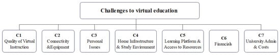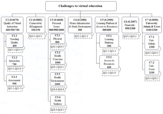 There is a rich tradition of using AHP-based assessment frameworks taking advantage of the rating model approach. These frameworks have been used to evaluate proposals, such as vendor assessment in public bids [] and similar evaluation tasks []. More recently, they have also been employed, in combination with advanced statistical techniques, as a psychometric assessment tool for organizational behavioral dimensions []. Following these practices, the questionnaire used in the previous stage also included questions developed from the most frequent quotes from students in the qualitative phase of the study. Based on this, an AHP assessment model for the top virtual instruction challenges in the context of the pandemic was proposed, as shown in Figure 2. Each challenge constitutes one of the dimensions to be considered when assessing the challenges to virtual instruction. Below each challenge dimension, a list of survey questions (also called indicators) was developed to assess the specific dimension.