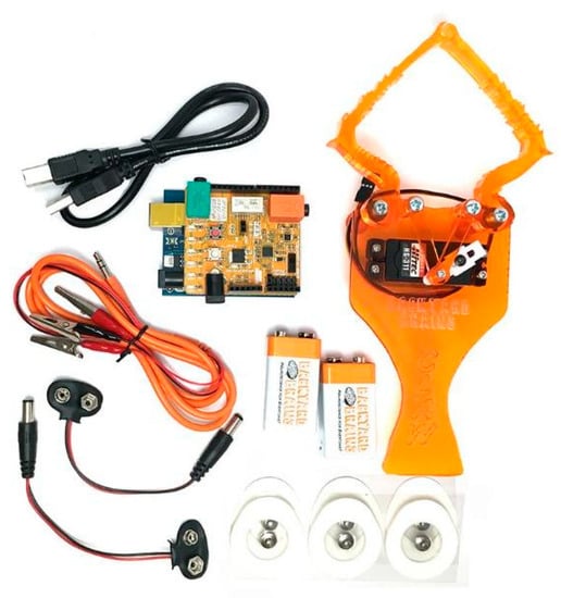 - Backyard, B. The Claw Bundle with the Muscle SpikerShield. Available online: https://backyardbrains.com/products/clawbundle (accessed on 30 July 2022).