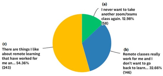 Q9—What are your post-pandemic learning desires? Note: Survey response alternatives: (a) “I never want to take another Zoom/Teams class again”; (b) “Remote classes really work for me and I don´t want to go back to learning in person”; and (c) “There are things I like about remote learning that have worked for me and my learning style, but I prefer in-class courses”.