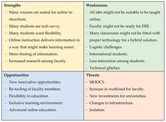 An organization’s strengths, weaknesses, opportunities, and threats can be identified and analyzed using the Strengths, Weaknesses, Opportunities, and Threats (SWOT) framework (see Figure 1). The main objective of a SWOT analysis is to raise awareness of the variables that influence business decisions or the formulation of business strategies. In this study, we identified the strengths, weaknesses, opportunities, and threats that the university sector has faced during the COVID-19 pandemic, and still may be facing due to students not wanting to return to campus. The articles considered suitable for the literature review were divided into four categories, using open coding and a thematic approach by identifying themes. The coding consisted of noting the citation, year of publishing, title of the research article, location, name of publishing outlet, and theme. The information found regarding themes was later compared to the respondents’ open responses.