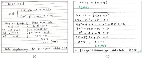 A typical properties strategy for solving Task 3 is as follows. Using the property of absolute value, i.e., for , a student rewrites the equation into . Next, squaring both sides of the equation and doing algebraic manipulation and simplification leads to . This quadratic equation has the solutions or . By substituting each of these solutions to the initial equation, it can be concluded that is the only solution for the absolute value equation in Task 3. The action of verifying the solution through substitution concerns the characteristics of symbol sense in the sense of checking for the symbol meanings after the implementation of a solution procedure. Figure 1 shows representative examples of the pre-service teachers’ written work for Task 3. Figure 1a shows the use of the definition strategy, and Figure 1b shows the use of the properties strategy.