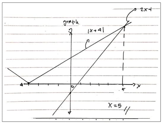 A typical graph strategy for solving Task 3 is as follows. A student draws the graphs for and on the same Cartesian coordinate. The solution of the absolute value equation can be interpreted geometrically as the abscissa of the intersection point(s) of the two graphs. As the intersection point of the two graphs is (5, 9), the solution of the equation is . We view that the ability to interpret the solution of the equation geometrically concerns symbol sense characteristics [22]. Figure 2 presents an example of the use of the graph strategy in solving the absolute value equation .