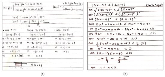 A typical properties strategy used by the pre-service teachers is as follows. Using the property of absolute value, i.e., for , a student rewrites the inequality into . Next, squaring both sides of the inequality, doing algebraic manipulation and simplification, leads to . The solution of this quadratic inequality is . Using and applying appropriate properties of absolute value for solving inequalities, in our view, shows not only the skill to use procedural knowledge but also the characteristics of symbol sense, i.e., the ability to see important structures in symbols and to check for the symbol meanings before the implementation of solution strategies. Figure 3 presents representative examples of the written work for Task 6. Figure 3a shows the use of the definition strategy, and Figure 3b shows the use of the properties strategy.