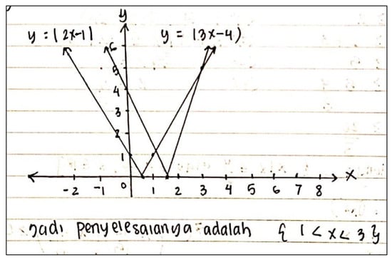 A typical graph strategy for solving Task 6 is as follows. A student draws the graphs for and on the same Cartesian coordinate. The solution of the absolute value inequality is geometrically interpreted as the interval(s) of values such that the graph is below the graph of . From this graph strategy, it can be obtained that the solution of the inequality is the interval . Figure 4 presents an example of the use of the graph strategy in solving the absolute value inequality . A small number of participants who used this strategy might be caused by the fact that drawing the absolute value function graphs is not easy without using, for instance, graphing software. One of the interviewees said that “Using the graph method is quite easy and practical to see the solution of an absolute value inequality. However, drawing graphs are often difficult without using any mathematical software!” We view that the ability to understand the relationship between the algebraic expressions in the form of inequalities and their corresponding graphs shows a symbol sense behavior [22].