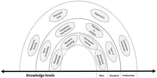 To organize the findings and considering the experience and cumulative knowledge impact, we tried to adopt the proposed frameworks by [23,25] to develop a “rainbow” framework for those statistics’ threshold concepts. In this study, we presented only the concepts that had the greatest frequency (n ≥ 10). Using the revised Blooms’ taxonomy [26] and based on the participants’ inputs, we proposed three knowledge levels learners should go through to understand statistics: basic, discipline, and professional (Figure 1). The basic level was equivalent to both factual and conceptual knowledge in the revised Blooms taxonomy, while discipline and professional levels matched with procedural and metacognitive levels, respectively. We determined that, at the basic level, learners should be able to rev = call and understand fundamental information about statistical research methods and random sampling. In addition, they should be able to perform fundamental tests related to data distribution and should be familiar with statistical descriptions. As students master these concepts and improve their skills to that level, they move into the second level of learning: discipline. At the second level, they are exposed to basic probability and probability distribution. The differences between populations and samples should be clear to learners at this level. In addition, they should be able to start to apply the knowledge and skills they have thus acquired to real data, so they can identify and conduct the required analysis of the data. Last, as learners progress to learning topics at the professional level, here, they are not only able to conduct advanced analyses, such as regression and hypothesis testing, but also, they become skilled at evaluating and justifying their findings. At this level, according to the proposed statistical threshold concept rainbow (Figure 1), the students are considered statisticians!! Instructors can use this rainbow with consideration to the cognitive process structure and revised Bloom taxonomy dimensions to develop course curricula that focuses on threshold concepts that should be taught at the different knowledge levels. Additionally, considering statistics instruction, and as a continuum, leads to redesigning curricula by linking and scaffolding courses in a systematic way that helps learners build on the knowledge that they have acquired. As a reader may notice that we did not include all the identified threshold concepts in the rainbow, this provides a research opportunity to distribute the concepts according to the curricula design. Moreover, it is predicted that the use of the threshold concepts and the proposed diagram will help achieve the objective as discussed by [27] about the importance of bridging the knowledge gap between the teacher and the student.