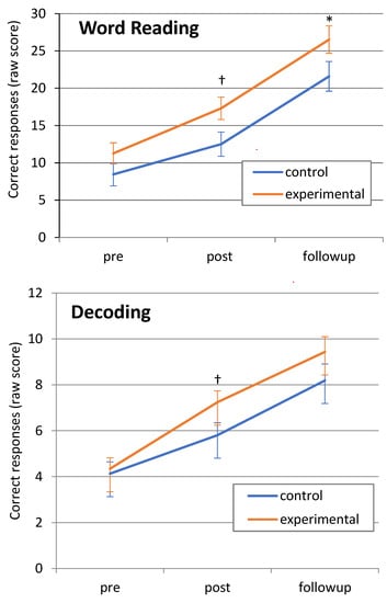 Time by condition effects were significant for each of the literacy measures, indicating greater growth in the experimental group: for word reading F(6, 24.8) = 24.83, for decoding F(5, 238.8) = 35.93, and for spelling F(5, 112.7) = 38.91 (all p’s < 0.01). Post hoc comparisons (with Sidak adjustment for multiple comparisons) showed trends for group differences in word reading and decoding measures at post-test (p’s = 0.07), with the experimental group performing better. There was also a significant group difference in word reading at the follow-up time point (p < 0.01) (see Figure 3).