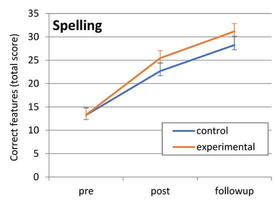 Spelling (or encoding) was assessed three times with the primary spelling inventory in Words Their Way [71]. The task involves spelling dictated CVC and CCVC words, and spellings are scored based on the number of features written correctly—for example, initial and final letters, and short and long vowels. Children in kindergarten (around 5 years of age) begin to use the alphabetic principle to spell, beginning with consonants, followed by medial vowels [71]. Therefore, children could earn points by representing single letters, or partial spellings associated with the word. The total features score across all the items (total possible points = 74) was entered into group comparison analyses.
