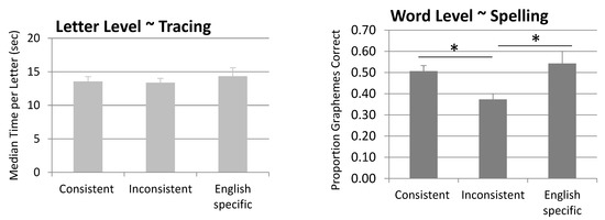 To address the second research question, that particular grapheme-phoneme pairs would be more challenging to learn, we examined data from the lesson-by-lesson performance, involving the letter-level tracing time, word-level spelling, and text-level search time. Three types of graphemes were compared in repeated measures ANOVAs to see whether they elicited differences in tracing time, spelling, and search time.