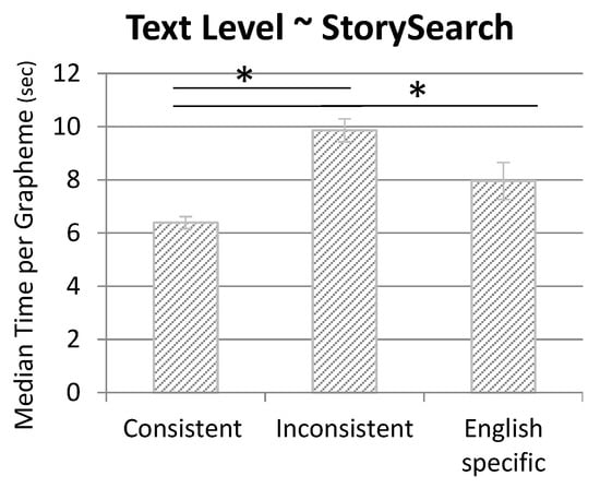 Figure 5 shows plots of children’s performance on 3 tasks (at the letter, word level, and text level) across the three types of graphemes. Within each grapheme type, children’s median response times (in seconds) were calculated for tracing and story search, and the proportions of correct responses were calculated for the spelling task; these data were compared in repeated measures ANOVAs. The data showed that spelling and letter search were affected by the types of graphemes being learned, F(2, 56) = 7.16, p < 0.01, and F(2, 60) = 12.38, p < 0.01, respectively. Graphemes corresponding to more than one pronunciation or specific to the English language were more challenging to learn for this group of children. Spelling was less accurate for inconsistent graphemes (adjusted LSD contrast p’s <0.01), and letter search was faster with consistent graphemes than either English-specific ones (p = 0.04) or inconsistent graphemes (p < 0.01). On the other hand, the tracing activity (letter level of the program) showed no effect of grapheme type, F(2, 69) = 0.49, p = 0.56, as would be expected since this was purely a motor skill; these findings highlight the use of technology-based methods to gain online information about student performance during learning activities.