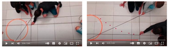 To the students of Group B, the mathematics teacher proposed a performance, specifically a “dynamic” activity to be carried out with a hula hoop, three nylon ropes, two rigid rods and red discs. With this equipment, the students would have had to perform a series of gestures to place the discs on the floor of a school terrace. The teacher had anticipated that the positions of the discs would later be reflected in the witch of Agnesi that the physics professor had spoken of in his lesson.