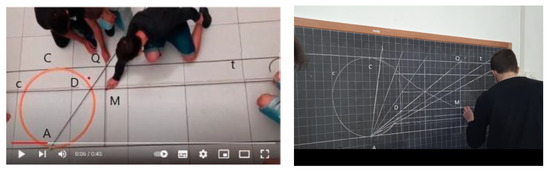 The students, following the style of Euclid, named the meeting points of the lines they had drawn on the blackboard with capital letters and then recognized, in these graphic traces, objects of geometry such as segments, the circle, its diameter, parallel lines between them, the straight lines tangent to the circle, the right triangles, a rectangle, all geometric elements that were repeated in each of the configurations produced to find the position of the disk to be deposited on the floor. Again, urged by the teacher, they recalled some properties that characterize the identified figures. An example of such activities is shown in Figure 3.