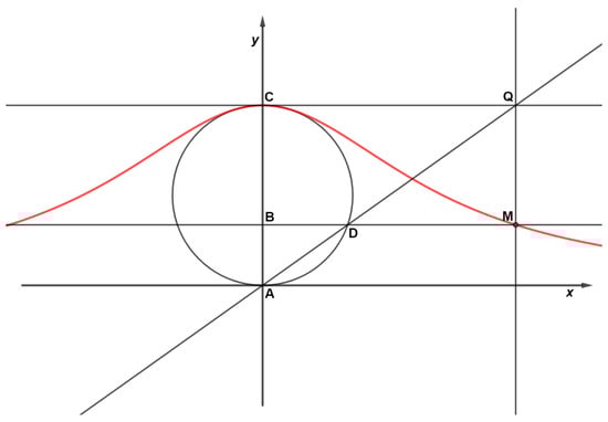 We took a circle, two of its diametrically opposite points A and C, we considered the tangent to the circumference at point C. Then, we considered a point D on the circumference different from A and C and we traced the line AD. We called Q the meeting point of the line AD with the tangent in C to the circumference. We have considered the line parallel to the tangent in C, passing through D, and we have seen that it meets the line parallel to the diameter AC, passing through Q, at a point M. The point M is the place where we placed our red disk. To find other points analogous to M we changed the choice of point D on the circumference and we repeated the procedure, reproducing the same pattern each time.