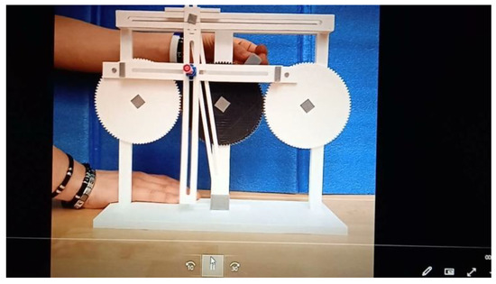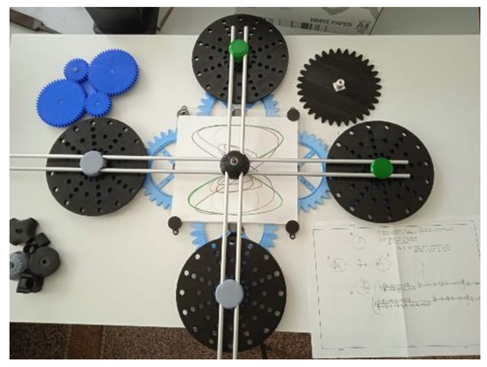 The machine, in the minds of the students, had to reproduce the effect of the movements of their mates in the video and of those who had drawn the witch on the blackboard. Those movements could be obtained with a gear with three cogwheels and slotted arms: one free to move parallel to itself and the other constrained to simulate a beam of straight lines. The main difficulty was the sizing of the parts that had to overcome the frictions. After countless attempts, approximations, and improvements, they have produced a prototype, as can be seen in Figure 7, capable of drawing a part of the curve.
