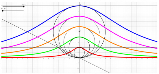 To complement the construction of the machines, the students also produced a visualization of the curves using tools made available by computer science [48], in particular using the GeoGebra dynamic geometry software [49]. The result of the construction with GeoGebra is represented in Figure 9, where five witches are constructed interactively, using suitable sliders, for five different values of the radius of the circumference.