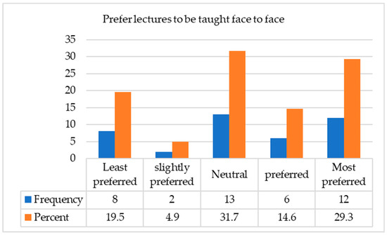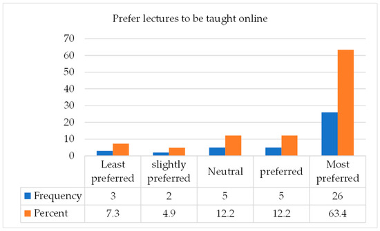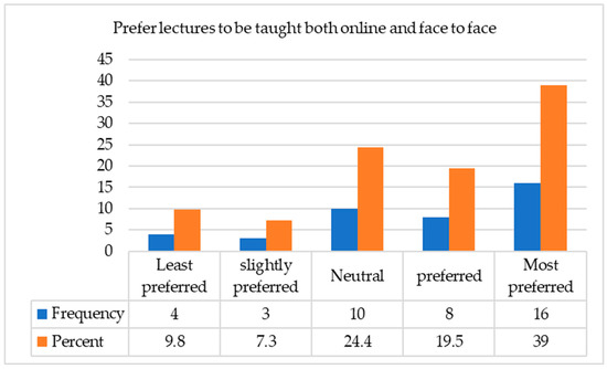 Figure 1, Figure 2 and Figure 3 show that most students (63.4%) preferred lectures to be taught online, 29.3% preferred lectures to be taught using the traditional approach (face–to–face), and 39% of the students preferred both online and face-to-face lectures. Therefore, it is evident that students can adapt to the technology-enhanced teaching and learning strategies that fit well with the present scenario of the COVID-19 pandemic, making it difficult for face-to-face teaching and learning.