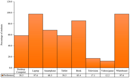 It is widely acknowledged in many research studies that considering the students’ technology preferences and perceptions will be critical to successfully integrating technology in physics instruction and learning [22]. In support of this notion, Mirriahi et al. asserted that designing learning environments taking into account students’ technology preferences would lead to high levels of acceptance of the technologies by students [23]. Similarly, Saeed et al. believe students’ different learning styles deeply influence their technology preferences, and technology positively impacts achieving balanced academic performance [24]. Conole et al. conducted research to find out students’ technology preferences and why they prefer them. The results showed that students are utilising technologies to support their learning. They indicated that Google, Wikipedia, word, instant messaging (IM), and podcasts were being utilised for information searching and handling. They also stated that students used technologies like e-mail, MSN messenger, skype and blogs for communication, especially with their friends, when discussing their learning materials. Lastly, for assignments and homework, the students indicated that they were using Microsoft Office (Word, Powerpoint and Excel) [22,25].
