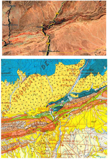Several fieldwork tools were used to introduce the field and stimulate students’ debate and questioning. Among these tools are topographic and geologic maps, satellite images, and geotechnical and mechanical tools. The geological conditions are locally contrasting, sometimes in the micro-scale catchment, and allow discussions of the geomorphic drivers and processes. The geologic map analysis is therefore instructive as a pre-basis for the field’s main work. The geologic map used in our case is Carte Geologique du Maroc, 1993, Tineghir 1 100,000, catchments. It is compared with the geologic maps Carte Géologique du Maroc, Jbel Saghro-Dades 1 200,000 or Carte Geologique du Maroc Ouaouizarhte—Dades 1 200,000 scale, to offer opportunities for multiple scales data discussion and develop pertinent skills of reality observation and apprehension with maps of different scales (Figure 2).