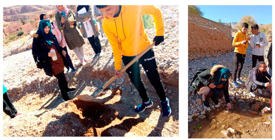 In Morocco, despite official directives, teaching is considered mostly theoretical and deficient in practical approaches either in the laboratory or in the field. The Moroccan National Assessment Authority (INE) and the Superior Council for Education, Training and Scientific Research (CSEFRS) [14] are leading a National Learning Assessment Program (PNEA) since 2016. This program focuses on measuring the student’s achievement and the internal efficiency of the educative system. The analytical results of the survey among students in recent years of primary and college secondary levels confirm that soft skills acquisition is still weak. A total of 47% of students assimilated less than 38% of the life and earth sciences program prescribed by the Ministry of National Education for the third year of college secondary school. Only 24% of interviewed students had acquired more than 55% of the program. The goals in terms of knowledge skills achievement are not attained. The soft skills achievement under the present-day education system is generally weak, as confirmed by previous studies [15,16]. El Hammoumi et al. [17] suggested pedagogical innovation using interactive graphic animations to reduce the gap and develop the soft skills of baccalaureate students in life and earth sciences. They conclude with the fact that animations in the classroom are useful in earth sciences’ didactic tools. However, the realities of observation in the field may be also instructive as they offer better opportunities to describe, debate, explain, and develop students’ skills. In this point of view, practical skills either in the laboratory or in the fieldwork may be framed by a large vision that integrates the links between factors and processes in a continuous interaction between nature and humans. Unfortunately, fewer studies focus on this approach. The fieldwork in teaching earth sciences is marginal in most educative systems.