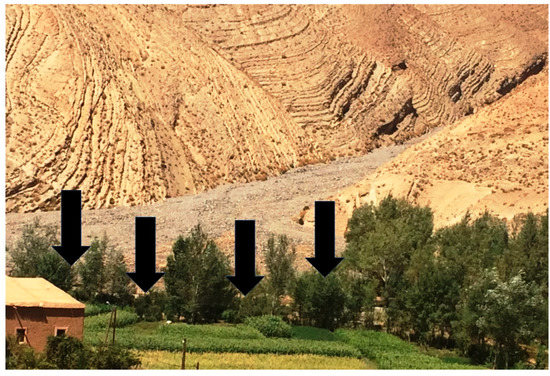 The multiple ravines sculpted on valley flanks offer pertinent elements to discuss the interactive processes integrating the lithologic and stratigraphic roles in weakening the cohesion of substrates and structures. The layers’ inclination due to tectonic pressure in the past when exposed to episodic rain showers explains aggressive water flows and engenders active erosion on the summits and a rapid fans’ formation by aggradation downstream. Students were asked to observe the dynamic evolution of the geomorphic landscape and how the extension of these fans is currently frightening the traditional oasis and farming downward. In the Dades valley, their deposits are progressively covering the vital agricultural area in the oasis (Figure 6).