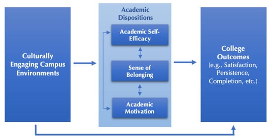 Extant research also suggests that the relationship between culturally engaging campus environments and college outcomes might be a complicated one [26,27,28,29]. For example, there is initial evidence that the influence of some aspects of culturally engaging environments—such as cultural familiarity, culturally relevant knowledge, cultural community service, and collectivist orientations—on students’ sense of belonging might be indirect, through their increasing the degree to which the campus validates students’ cultures, communities, and identities [28]. That is, if campuses provide opportunities for students to access those environments characterized by cultural familiarity, culturally relevant knowledge, cultural community service, and collectivist cultures, they are more likely to provide conditions in which students feel validated, which then results in stronger connections to the institution and the feeling that they belong within it. However, these studies are limited to analysis of how complex environments influence the sense of belonging, and scholars have yet to examine how these dynamics might shape other outcomes, such as academic motivation.