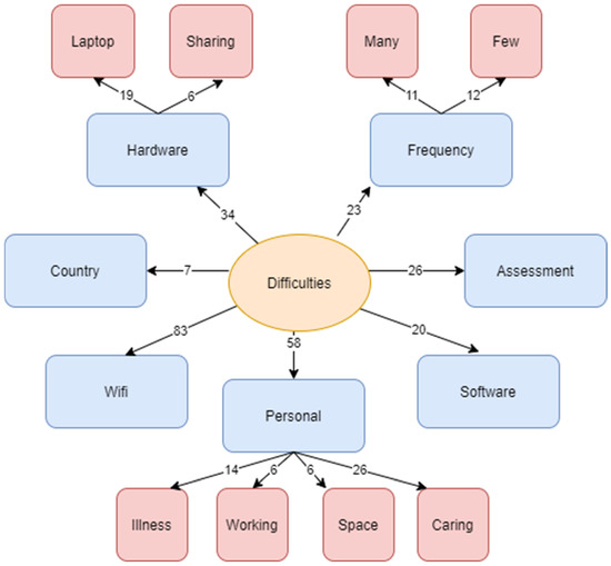 In total, there were 142 additional comments under this question, and the comments have been coded into a number of themes and sub-themes, summarised in Figure 1. From the centre, there are arrows leading to the seven themes that emerged from this question: Wi-Fi, hardware, software, and personal reasons, which emerged directly from the question itself, and assessment, frequency of difficulties, and country. Leading from the three latter themes listed, we see arrows directing us to the subthemes that emerged from these themes. The numbers listed alongside each arrow indicates the number of comments within each theme/subtheme.