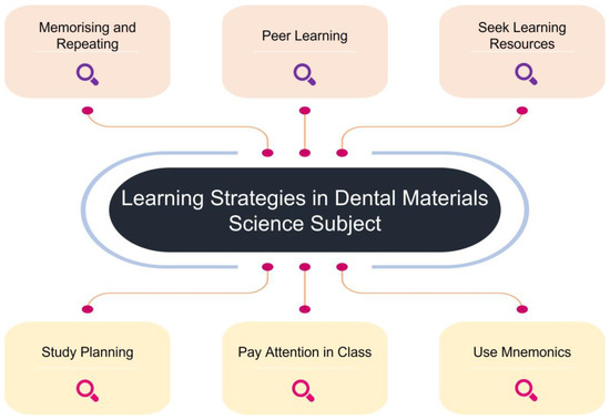 The first theme relates to undergraduate dental students’ strategies to study dental materials science. Six sub-themes emerged: (i) Memorizing and repeating, (ii) Peer learning, (iii) Seeking learning resources, (iv) Study planning, (v) Paying attention during class, and (vi) Using mnemonics.