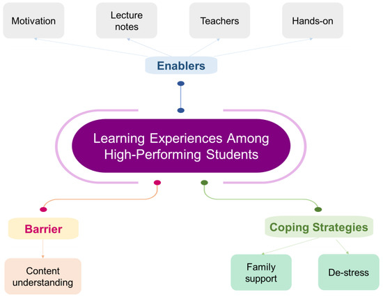Based on the subthemes in Theme 2 and Theme 3, a model based on learning enablers and barriers, as well as coping strategies with learning challenges among high-performing students, was developed and is illustrated in Figure 2.