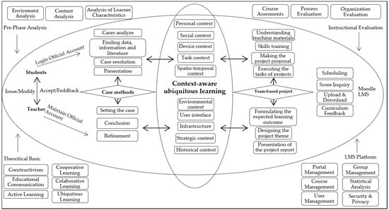 The structure of the context-aware ubiquitous learning design model based on case methods and team-based projects.