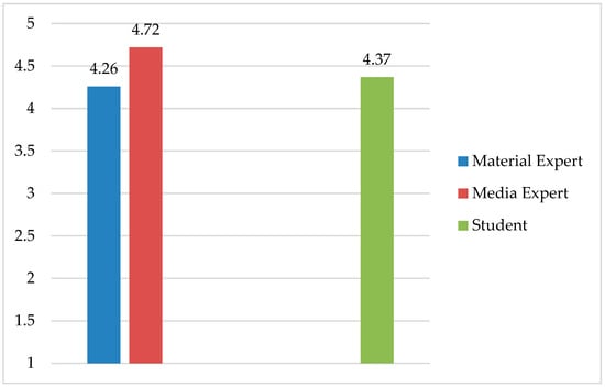 Figure 2 shows that the average overall assessment score for the learning material/content aspect by five material experts is 4.26, the media aspect by five media experts is 4.72, and the average assessment score of 162 students in the product trial is 4.37. These figures, according to the table used in converting quantitative to qualitative data on a scale of 5, are in the “Very Good” category and this means the material and media aspects of the product developed are feasible to be applied in learning activities.