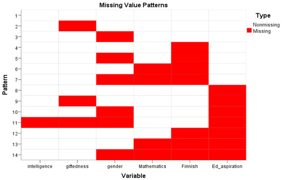 In educational aspiration, there were missing values in 28.6% of cases. The principal question was whether the missing values were a random process or a systematic bias. The missing values were inspected using Little’s MCAR test. As a result, the assumption that values are missing completely at random was rejected (Chi-Square = 57,849, DF = 35, p < 0.05). The procedures for dealing with the missing data depend on the nature of the data [75,76]. Because of the systematic bias in the missing values of the main variables, multiple imputation was used. Before performing imputation, we analyzed the pattern of the main variables. Since the missing data were found to have a scattered pattern toward a few variables, particularly educational aspirations, we used the monotone method (10 iterations) to impute data. All variables in the dataset (mindsets about intelligence and giftedness, educational aspirations, achievement in mathematics and reading, and gender) were included for imputation, and five imputations were created. Thus, for data analysis, SPSS provided us with five sets of analysis separately and a pooled analysis combined with all five results, which is used for reporting the results.