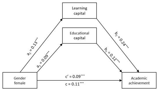 Standardized Regression Coefficient for the Relationship Between Gender and Academic Achievement, Mediated by Educational Capital and Learning Capital. *** p < 0.001.