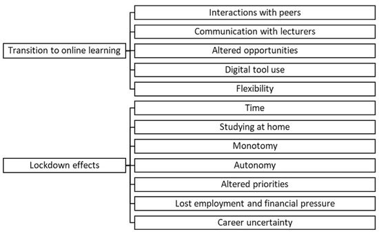 In the first survey, 81–95% of students answered the nine open questions and in the second survey, 27–51% answered the seven open questions. As indicated above, similar ideas were captured within the survey responses and interviews, with interviews providing further depth and clarification of ideas already present in the survey data. Based on all data, our analysis identified two themes (Figure 1). Firstly, students talked about the direct effects of the transition to online learning. Within this theme, there were five subthemes. Secondly, students commented on the effects of the lockdown in relation to seven different subthemes which impacted on their concentration and motivation to study and therefore had indirect effects on their learning.