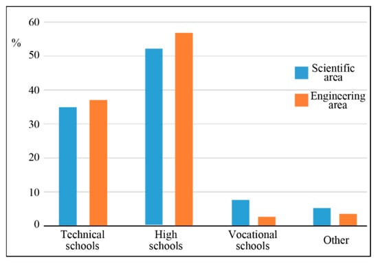 Students were also classified according to the kind of high schools they attended. Figure 1 shows a clear prevalence of high schools (more than 50% of the students were in the science subset, and more than 55% of the students were in engineering subset). Technical institutes represent the second group of schools of which the students of our sample attended (about 36–37% for both of the fields).