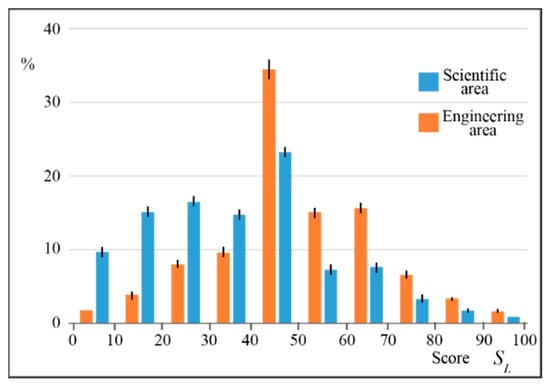 Distributions of the global performance in the Lawson’s test for the students in the scientific and engineering areas. The height of the bars indicates the percentage of students for the two areas in the corresponding score class.