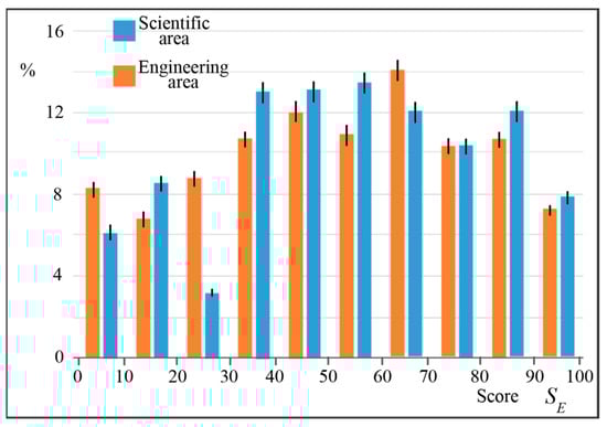 Distributions of educational success for the students of scientific and engineering areas. The height of the bars indicates the percentage of students in the two areas in the corresponding score class.