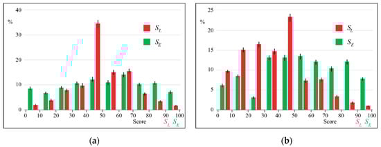The qualitative comparison between Figure 3 and Figure 4 suggested to us that we should perform a comparison between the score distribution of the two parameters ( and ) within each of the two subsets. This comparison is shown in Figure 5: part (a) compares the and distributions for the engineering subset, while part (b) shows the same comparison for the science subset. Apparently, none of the results in Figure 5 suggest that there is a correlation between the two parameters of interest ( and ). Moreover, they do not suggest a positive correlation; in fact, a careful examination of Figure 5b highlights a kind of “inversion of population” between the distributions of and : for the first parameter (red bars), the mean/low-score classes are more populated than the high-score classes, while the opposite trend can be observed for the second parameter (green bars).