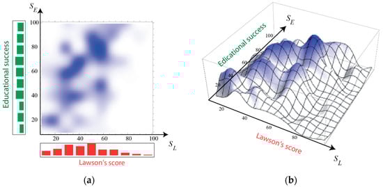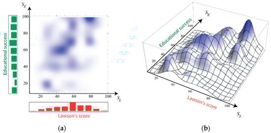 Therefore, this qualitative discussion suggested further representations and analyses of the data, starting from the dispersion in the Cartesian plane . Such a representation is shown in Figure 6 for the students of the engineering subset and in Figure 7 for those of the science subset in two different configurations: the usual two-dimensional form (Figure 6a and Figure 7a) and a meaningful three-dimensional elaboration (Figure 6b and Figure 7b). In such graphical representations, the correlation between the parameters represented on the two axes is visually encoded by the (more or less) marked distribution of the population along the diagonal of the plane . Comparing Figure 6 and Figure 7, we can observe that this correlation appears to be more evident for the subset belonging in the engineering area.